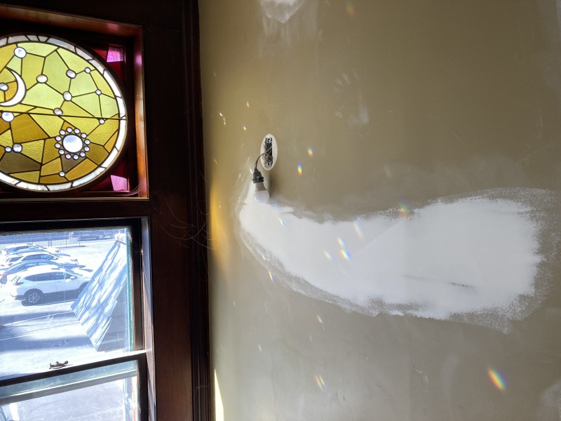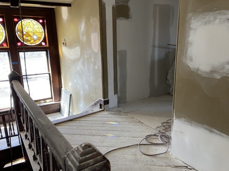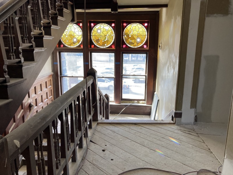 I’ve found it very hard to catch sunlight in the stained-glass window at just the right time – yes, I’m blaming the sun for being uncooperative – but here are a couple from the second floor looking into the stairwell. Rather than casting light tinted by the stained glass, there were prisms all about.