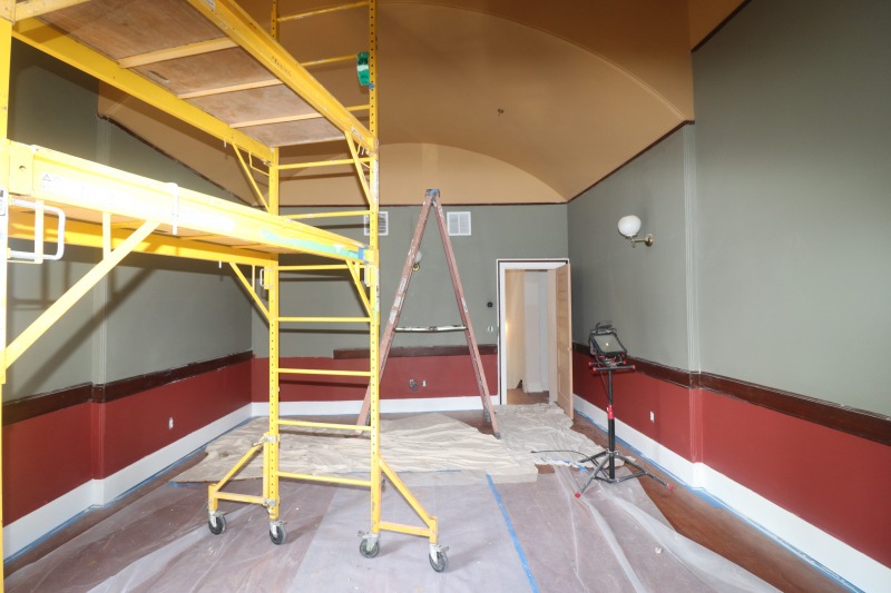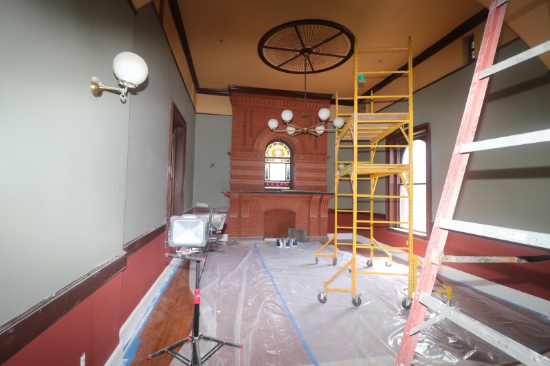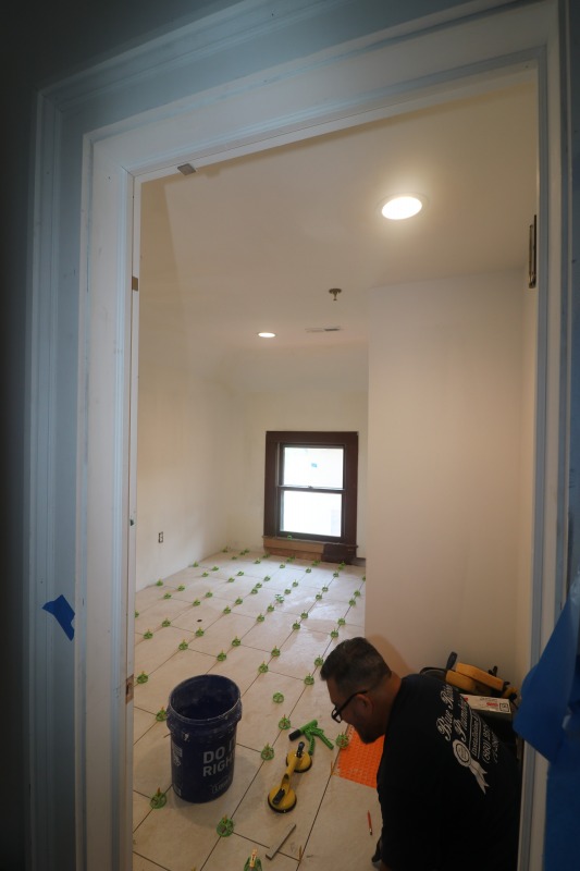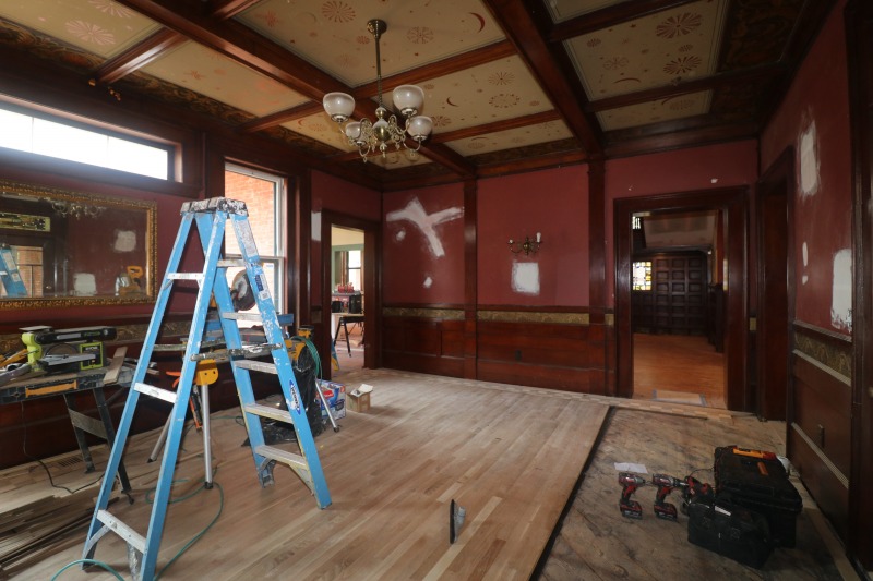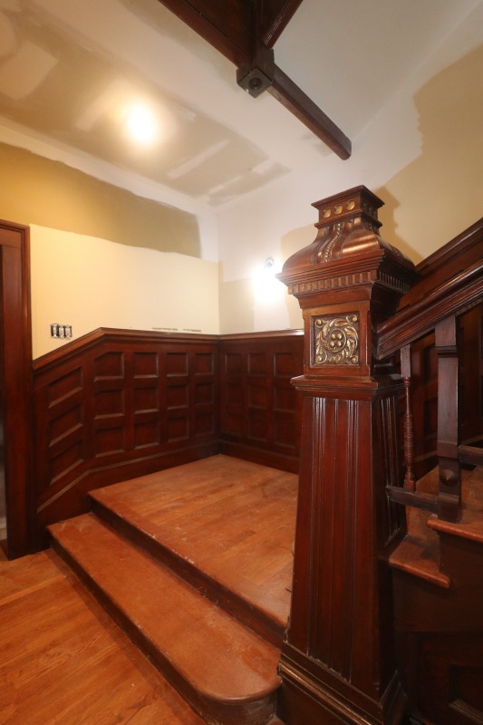 New floor going into the dining room. Restored newell post. Restoration of the billiard room nearing completion. Tile floor in the laundry room on the 3rd floor.