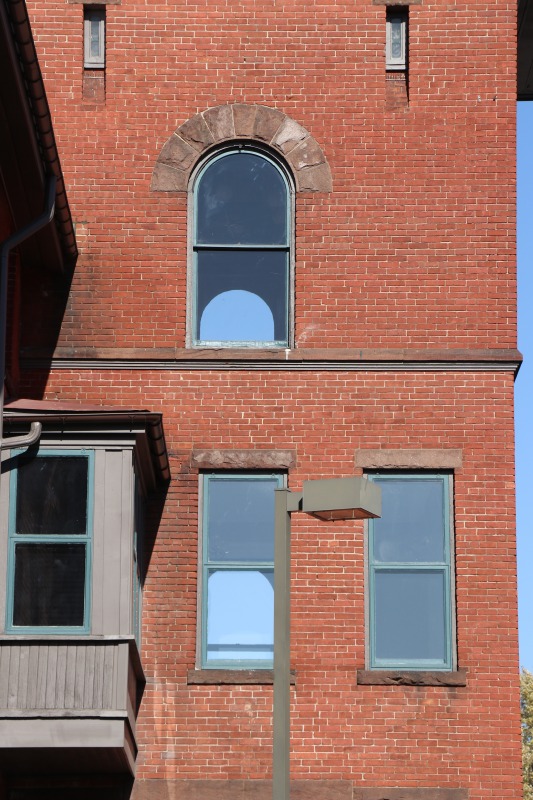 An interesting historic artifact is also visible in the detail shot. The brownstone cutting across the tower, just below the third story window, is probably the original soffit. We think that the Plimptons, as part of their 1884 addition, added the third floor.