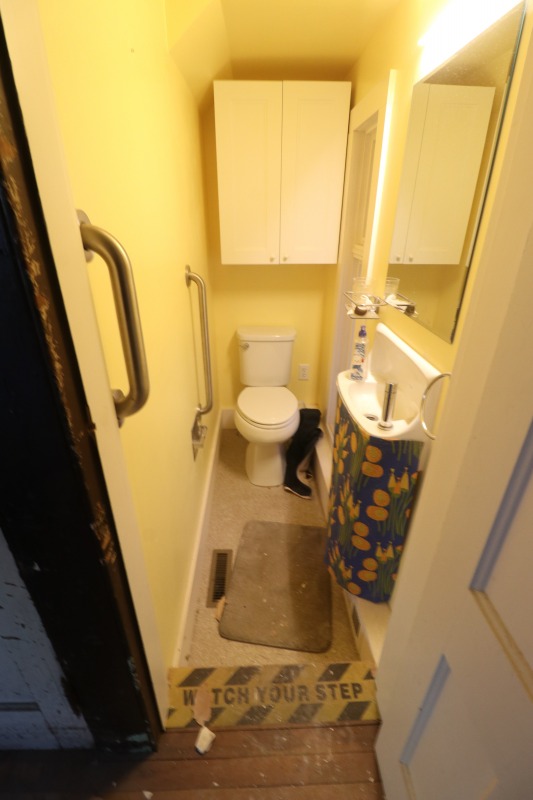 I have been fighting the good fight to save this little bathroom, but it looks like I am going to lose. This was a creative use of this space, and the sink in it was found as architectural salvage in England some 30 years ago. Our architect has struggled to work out a wider staircase, interior access to the basement, and a new kitchen space, which is why the bathroom will have to give way. Plus our construction manager insists that the bathroom isn't to code. Ah well. At least the sink will be salvaged, again.