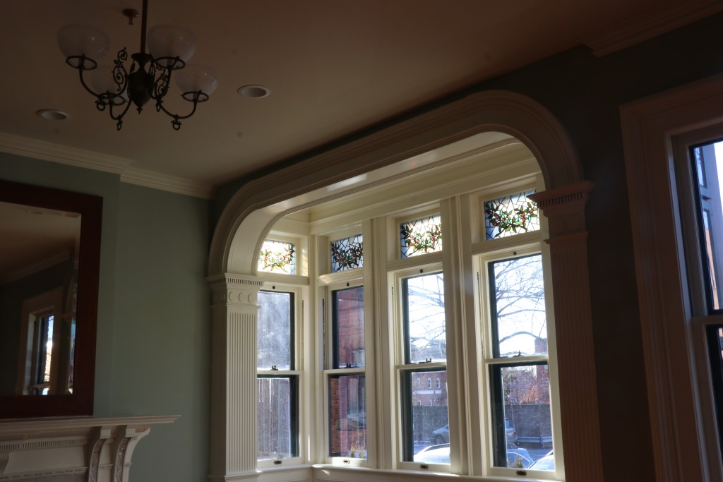 I have found it a real struggle to catch the stained glass at 847 Asylum Avenue in just the perfect afternoon light, in part because I'm not the best photographer in the world and in part because my timing seemed consistently lousy. However, it was recently pointed out to me that the stained glass was added in 1884-1885, when the surrounding landscape was very different. For one thing, that tree that casts a show along the west side of the house would not have been that tall 150 years ago, if it had been there at all. And, more significantly, Trinity Episcopal Church, which is southwest of the Plimpton House, didn't have its tower until 1912 -- and that was probably the last time the light I've been looking for was available.