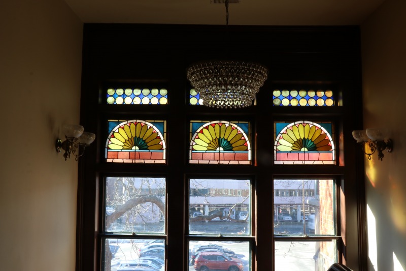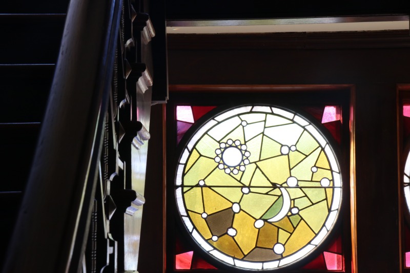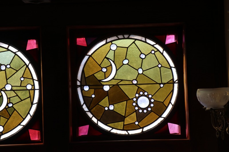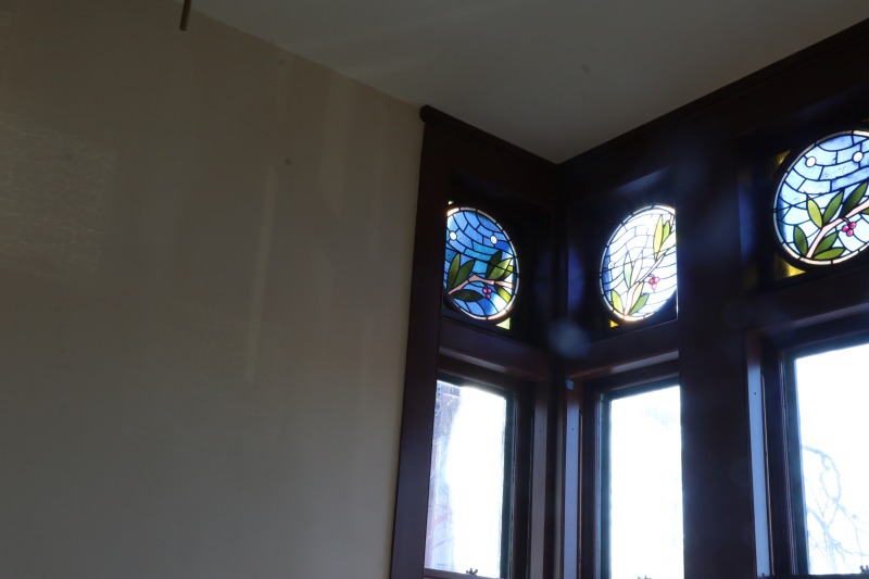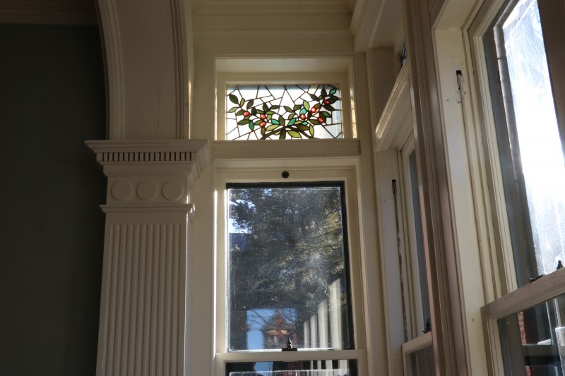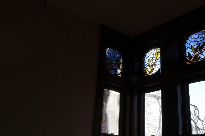 So I feel less bad than I did as I took these photos! It also highlights that not all of the stained glass is on the west side of the house: there's stained glass on the front of the house, too, which never catches direct sunlight, and then there's the dramatic stained glass in the fireplace in the billiard room, which catches the morning sun.