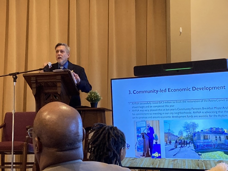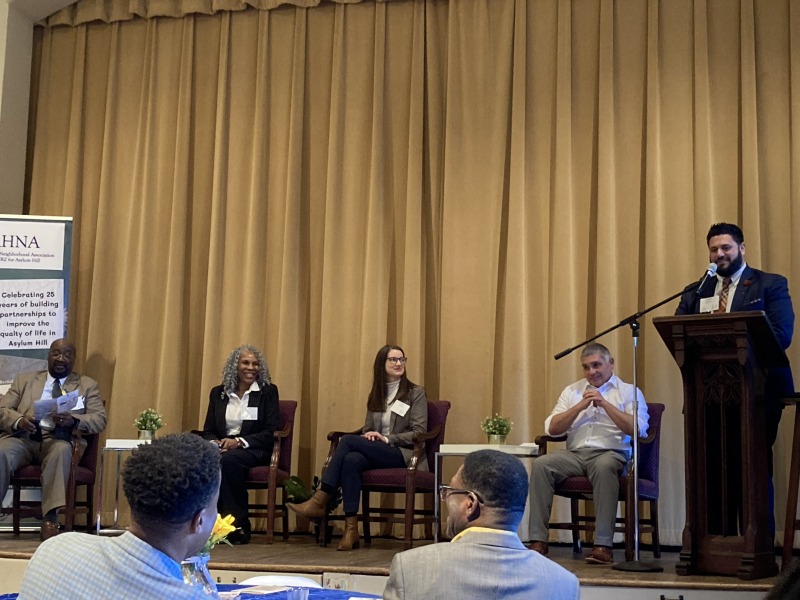 The Asylum Hill Neighborhood Association held its second annual breakfast for community stakeholders and partners. The event featured speeches by Janine McMahon, Ted Carroll, Erica Thompson, and Jay Williams and a panel discussion about economic development in Asylum Hill.