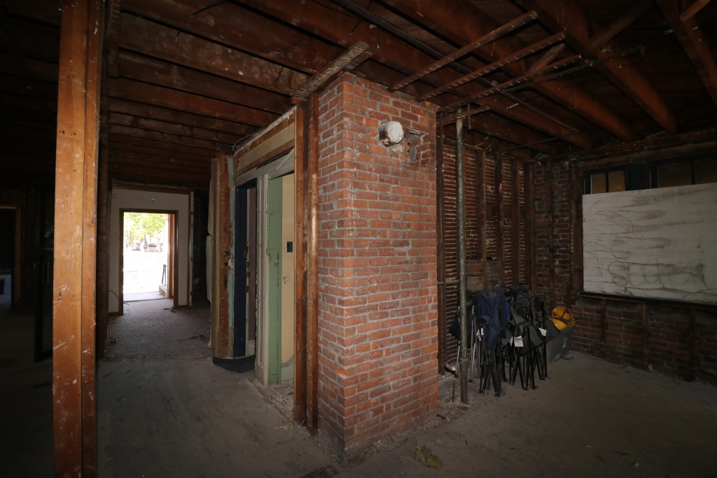 Now revealed! You can see it, the green threshold, to the left of the stairs to the basement. It apparently heads up to the landing between the first and second floors. We haven't pulled down that wall yet, so stay tuned.