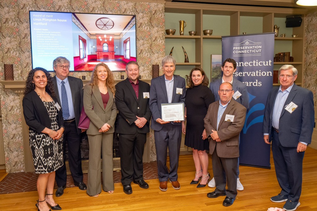 We attended the 2025 Preservation Connecticut Awards ceremony this evening at the New Haven Country Club. The award cited "NINA’s commitment to creating or renovating housing in the Asylum Hill neighborhood." The award recognized the project team, which was NINA Properties, Crosskey Architects, James K. Grant Associates, John Canning & Company, Connecticut State Historic Preservation Office, the City of Hartford Department of Development Services, the Capital Region Development Authority, the Local Initiatives Support Corporation, and the Hartford Insurance Group.