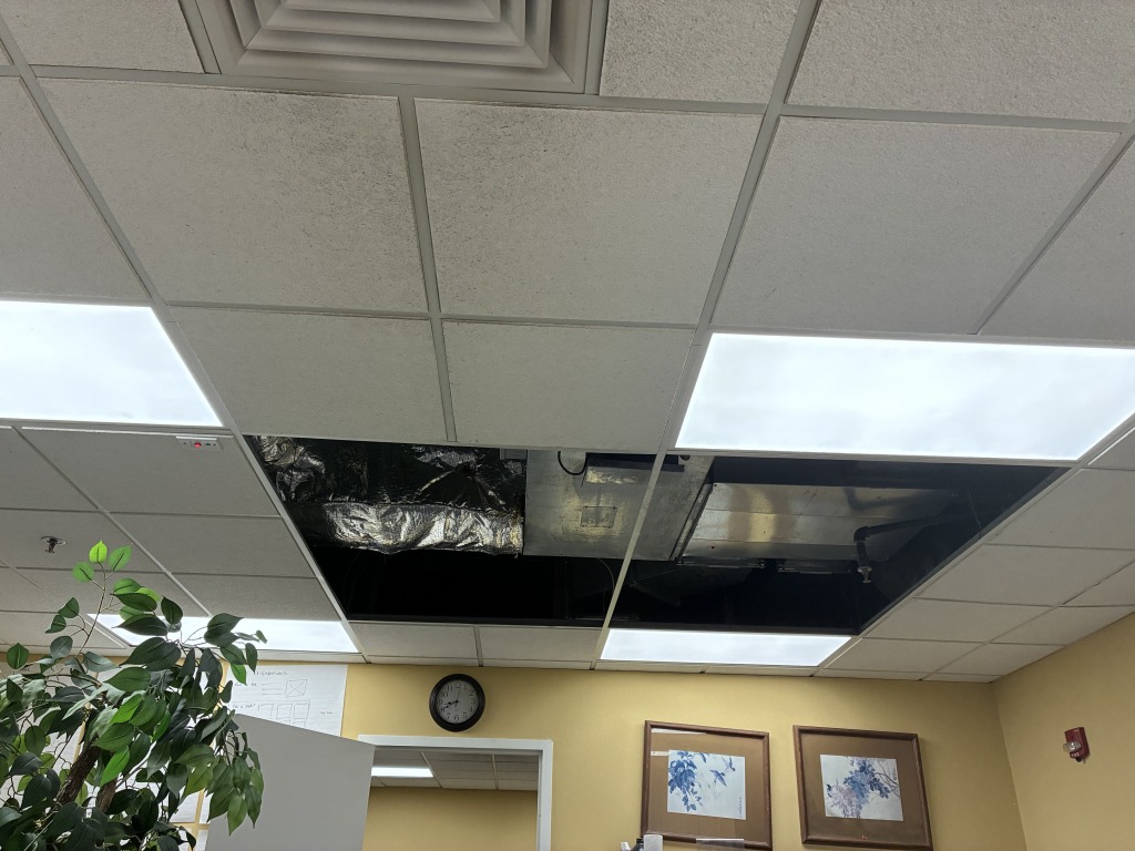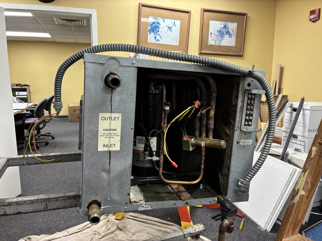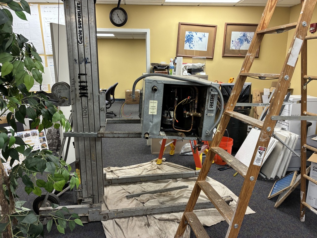 After just over two months without air conditioning, technicians arrived today to take out the old HVAC unit and then install - an old HVAC unit. They found a unit that worked in another part of the building, and that's what was installed today. At last we have cool air! All of these photos are of the old unit coming out. The "new" unit was already installed by the time I got back from lunch.