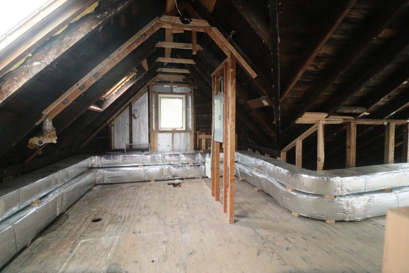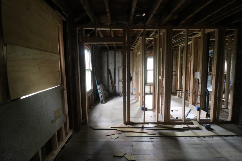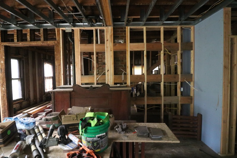 Beams in the kitchen. New wall in kitchen. Framing in the new primary bedroom. Third floor ductwork. Work on the front porch.