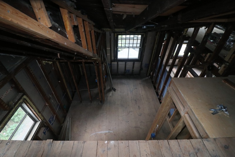 Work is still underway on framing at 102 Huntington, and now the rough electric is, too. There wasn’t much new in the way of things to see in the house until I came across this view. It looks down from the third floor into the bedroom on the southwest corner of the house.