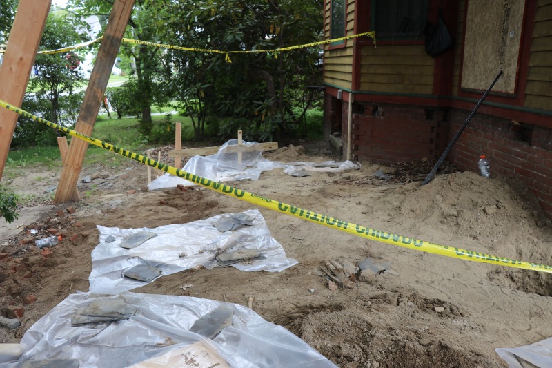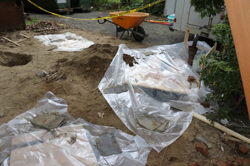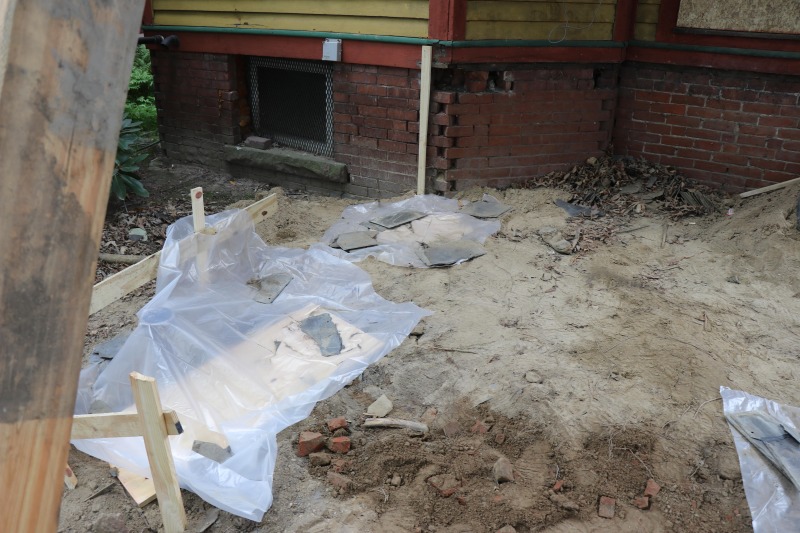 While excavating for the new porch, our contractors came across a cache of old slate shingles. Given the number of them, plus how neatly stacked they were, these were likely extra shingles leftover after a new roof had been installed. These shingles were made from Pennsylvania slate, which means that it flakes very easily. It also means that the roof would have had a shorter lifespan than if it had been installed Virginia slate shingles. Who knew? Our enterprising contractors used the found slate to hold down plastic protection for the newly dug footings.