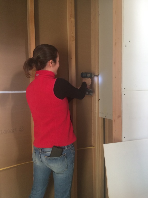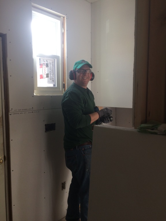 We had a small group of volunteers come down from The Hartford today to help us install sheetrock on the first floor at 52 Huntington Street. The group was organized by Andrew Daly, who also serves as the president of NINA's board of directors, and it included Kelechi Ndu and Sarah Needham. They were joined by Chris Young, a former colleague who now works at the Travelers. They hung sheetrock in the foyer closet, the study closet, and the half bath. Andy, Sarah, and Chris have all worked for us before, but this was Kel's first time volunteering on a NINA site.