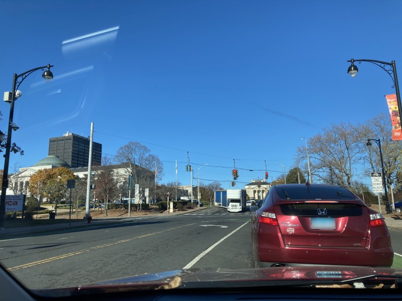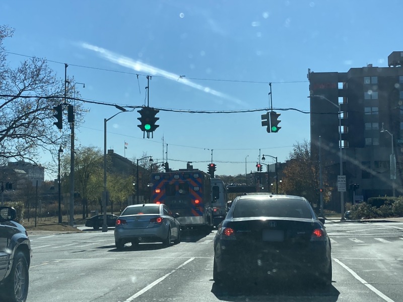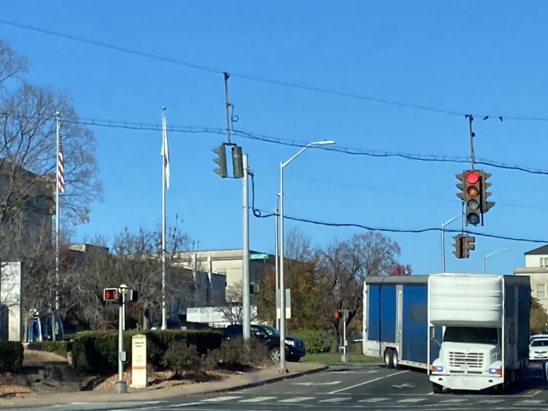 Category: NewsThese photos highlight why the two traffic lights get out of sync – it’s the pedestrian crossing signals. The light at Farmington is green, while the light at Asylum is red – and over on the right side of the intersection, the pedestrian crossing has seven seconds to go.
