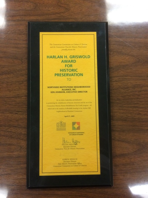 NINA was very honored to be recognized by the Connecticut Trust for Historic Preservation with their prestigious Harlan H. Griswold Award in HIstoric Preservation for exemplifying "Harland Griswold's leadership, vision, and selfless dedication to preserving Connecticut's heritage and who by deed or example have mad our state a better place for all of its citizens." We shared the award with Neighborhood Housing Services of New Haven, which like us works to preserve historic properties as affordable housing opportunities. CTHP has a nice write-up on its web site, and they also mention the other awards given out tonight. We especially want to extend our congratulations to Trinity College and the University of Hartford Hartt School of Music on their awards -- together we are all working together to preserve Hartford's history well into the future!Share this: